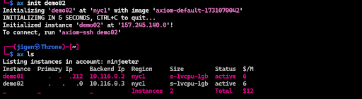 - Create another virtual machine named demo02. Once it is initialized, list all of your account instances with: ax ls