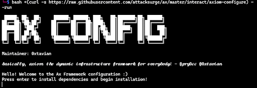 bash <(curl -s https://raw.githubusercontent.com/attacksurge/ax/master/interact/axiom-configure) --runView alternative installation methods here.