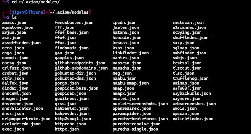 Although any additional arguments made available by the tool can be supplied, to save time, custom modules can be created. Modules are written as JSON files and saved in the ~/.axiom/modules directory.