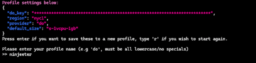 Select a region and default size (CPU, RAM). Once you have, press enter to save the configuration settings to a new profile by supplying an account name.